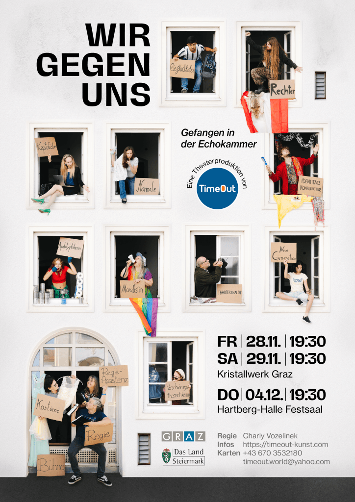 Mit dem neuen Theaterprojekt WIR GEGEN UNS – Gefangen in der Echokammer widmet sich der Kulturverein TimeOut im Jahr 2025 den Bruchlinien unserer Gesellschaft. Den Momenten, in denen Zuhören endet und Echokammern beginnen.
