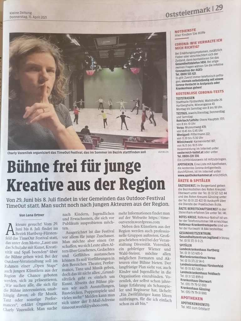 Das erste TimeOut Festival wird in der Zeit vom 29.06.2021 bis 08.07.2021 stattfinden. Mit der Erfahrung von 15 Jahren, im Bereich des Theaters für junges Publikum, möchten wir dies nutzen und ein Festival auf die Beine stellen, welches einen Platz für Kunst schaffen soll. Und auch wenn im Vordergrund die Jugend steht, ist das Festival als ein Ort zu verstehen, bei dem vom Kleinkind bis zu den Großeltern die unterschiedlichsten Menschen zusammen kommen und sich über Gesehenes, Gedachtes und Gefühltes austauschen können.