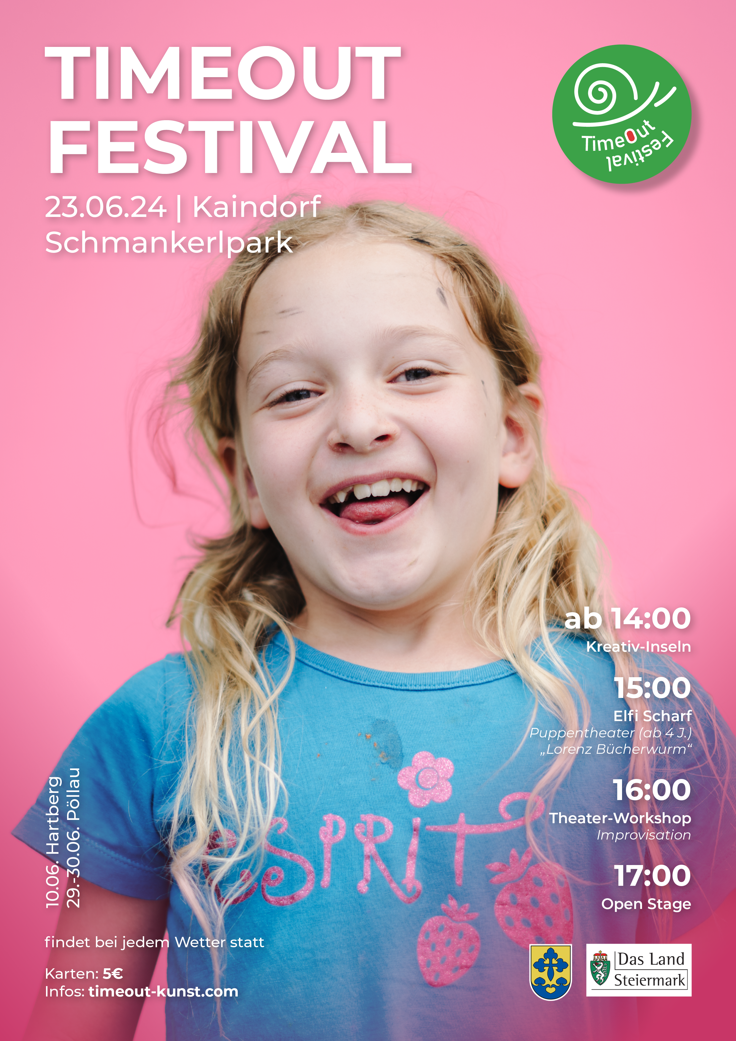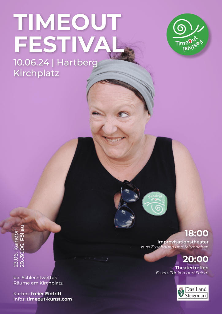 Beim „TimeOut Festival 2024“ in Kaindorf erwartet euch ein kreativer Familien-Nachmittag voller spannender Aktivitäten im Schmankerlpark! Wir starten um 14 Uhr mit den Kreativ-Inseln mit Malen, Lesen, Schminken und Spielen – hier ist für jeden etwas dabei! Wir freuen uns sehr um 15 Uhr Elfi Scharf mit dem Puppentheater „Lorenz Bücherwurm“ (ab 4 J.) bei uns zu haben! Anschließend folgt ein Improvisations-Theaterworkshop geleitet von Bettina Jäkel. Außerdem haben alle, die selbst gerne auf der Bühne stehen möchten, die Möglichkeit, sich bei der „Open Stage“ um 17 Uhr auszuprobieren. Um den Nachmittag abzurunden, werden wir gemeinsam ein einzigartiges Tageskunstwerk malen. Sei dabei beim „TimeOut Festival 2024“ in Kaindorf!
