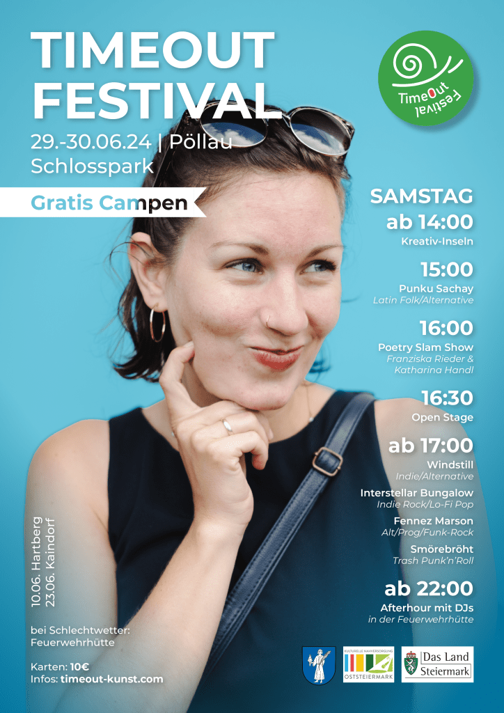 Vom 29.-30.06. wird der Schlosspark Pöllau zum Spielort des „TimeOut Festivals 2024“. Wir laden wieder mit ausreichend Musik und Kunst zum Verweilen und Feiern ein.