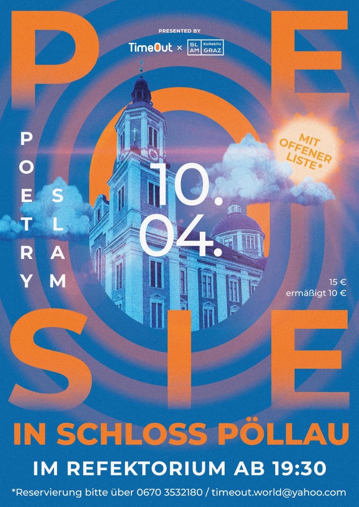 Am 11.9. holt der Verein TimeOut das Slam Kollektiv Graz nach Pöllau, um den ersten Poetry Slam der Oststeiermark auszurichten. Unter strengem Zeitlimit bleibt den Performer:innen nicht mehr als ihr Text und ihre Stimme, um das Publikum für ihre Poesie zu gewinnen. Anmeldungen von der offenen Liste werden gemeinsam mit erfahrenen Slammer:innen in zwei Runden um den Sieg performen, umrahmt von Musik und Jause vom Bauernladen.