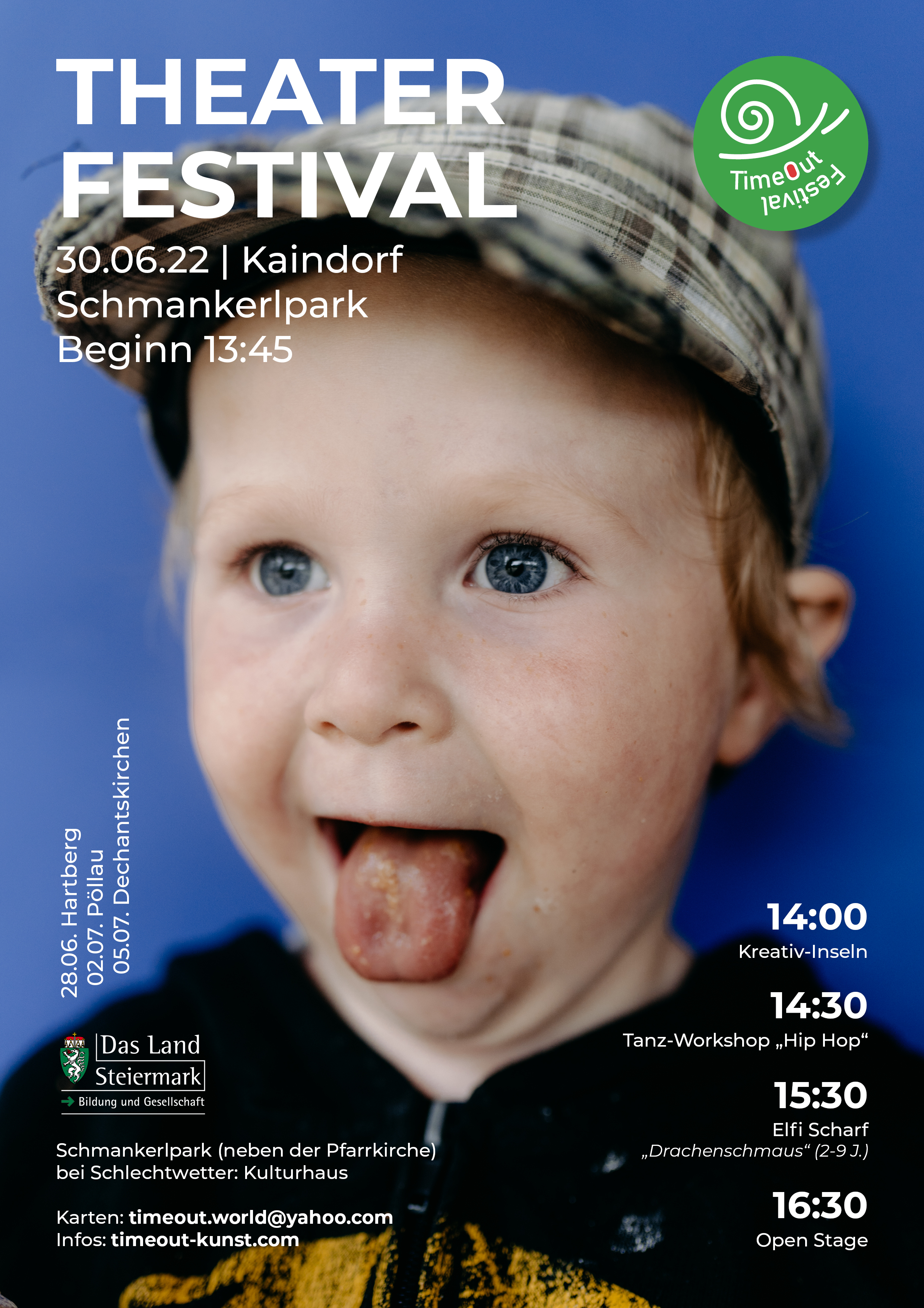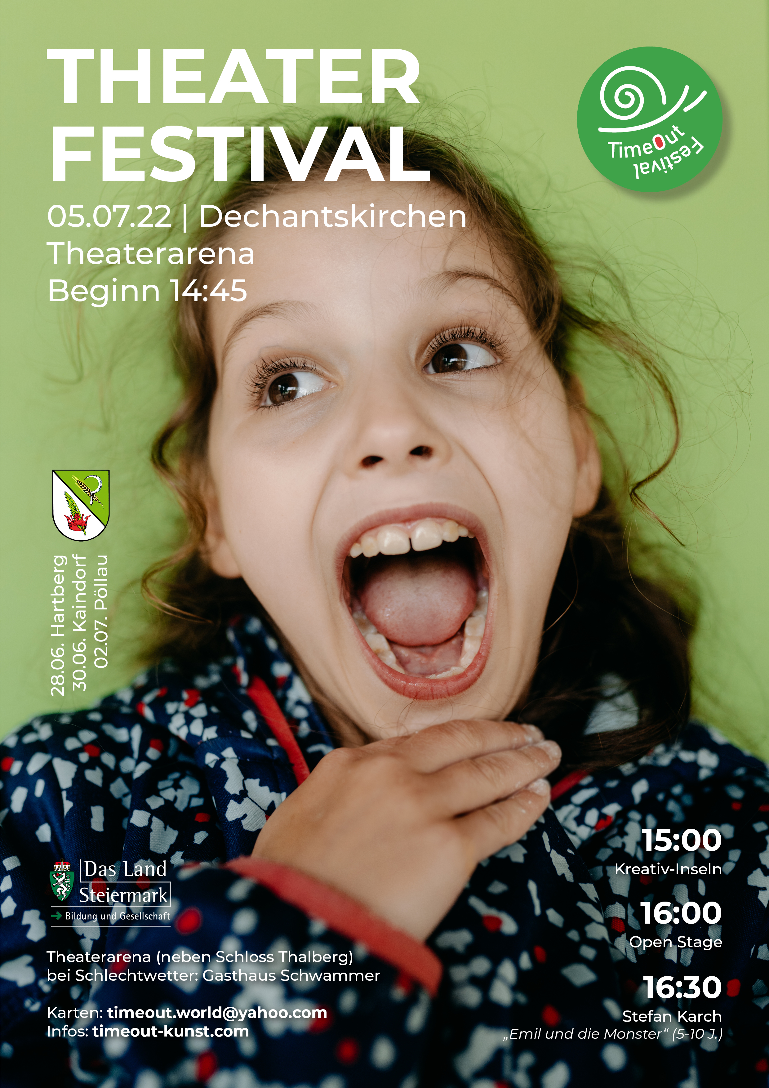 Das „TimeOut Festival 2022“ in Dechantskirchen ist ein abwechslungsreicher Familien-Nachmittag für Kinder (Kindergarten und Volkschule) in der Theaterarena neben bem Schloss Thalberg (Schlechtwetter: Kulturgasthaus Schwammer) von 15 bis 18 Uhr.