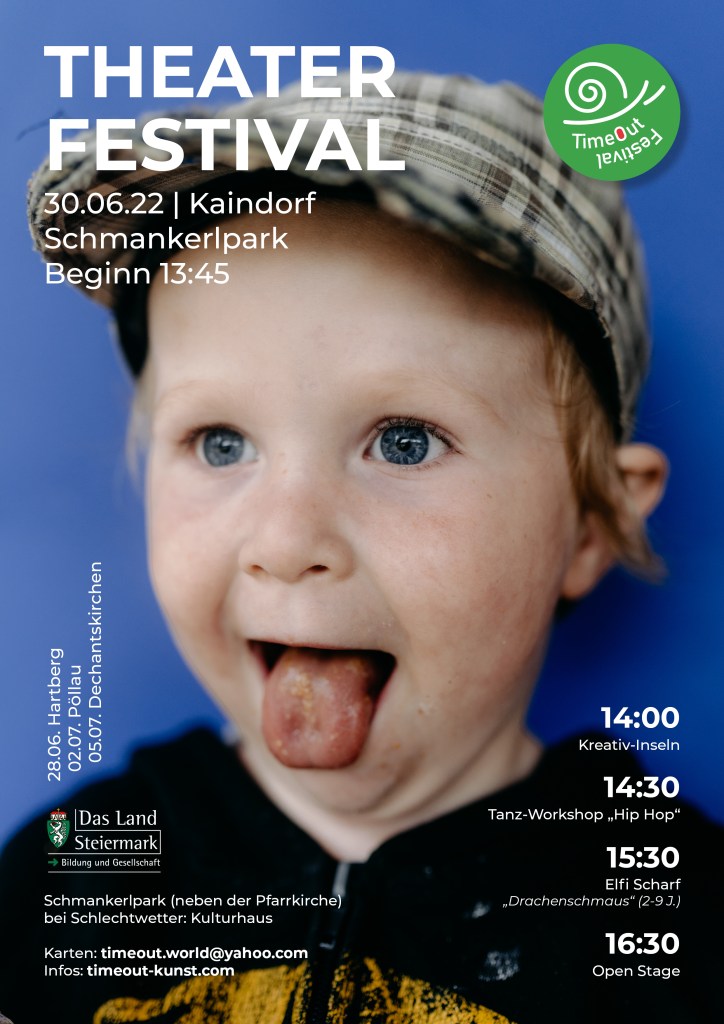 Das „TimeOut Festival 2022“ in Hartberg wird ein Theaterfest. Um 18 Uhr beginnen wir mit Improvisationstheater zum Zuschauen und Mitmachen. Und um 20 Uhr zelebrieren wir ein Theatertreffen, wo alle Theater Vereine der Region, schauspielinteressierte Menschen, Freundinnen und Freunde eingeladen sind mit uns zu FEIERN. Essen, Trinken, Reden und sich Austauschen. Damit wir wieder ein Stück näher zusammenrücken.Karten: Eintritt GRATISReservierung: timeout.wirld@yahoo.com