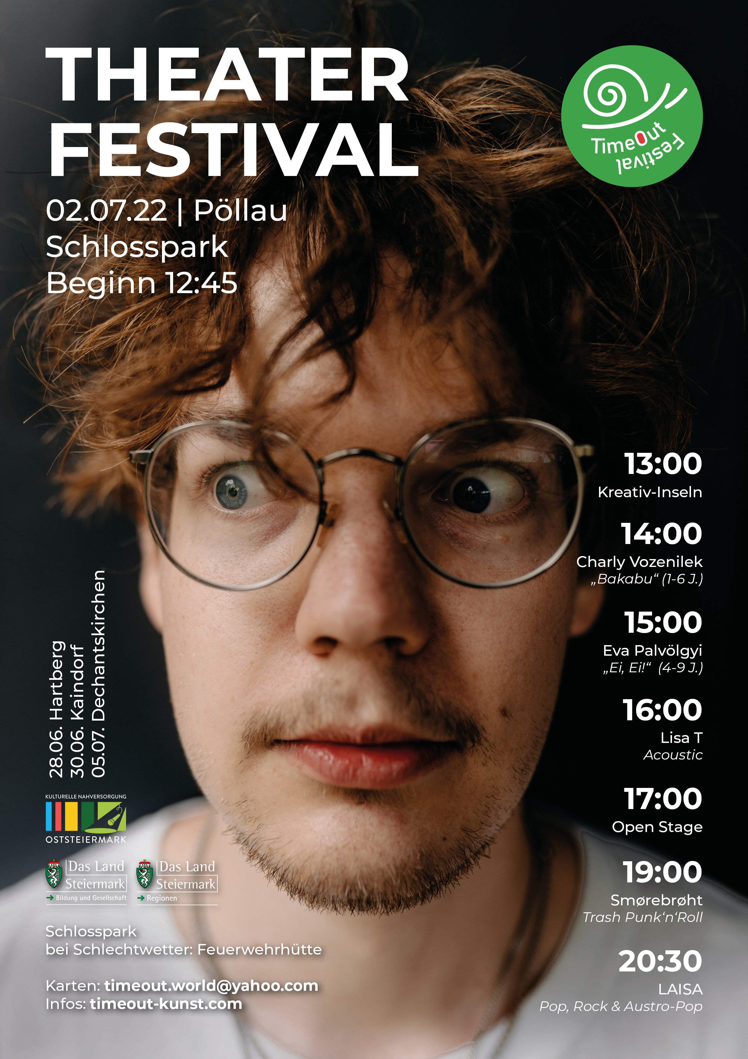 Das „TimeOut Festival 2022“ in Pöllau ist am Nachmittag ein abwechslungsreicher Familien-Nachmittag für Kinder (Kindergarten und Volkschule) im Schlosspark Pöllau (Schlechtwetter: Feuerwehrhütte) mit Fotografie- und Schauspielworkshops, Lese- und Bastelecken und mehr, von 13 bis 18 Uhr.